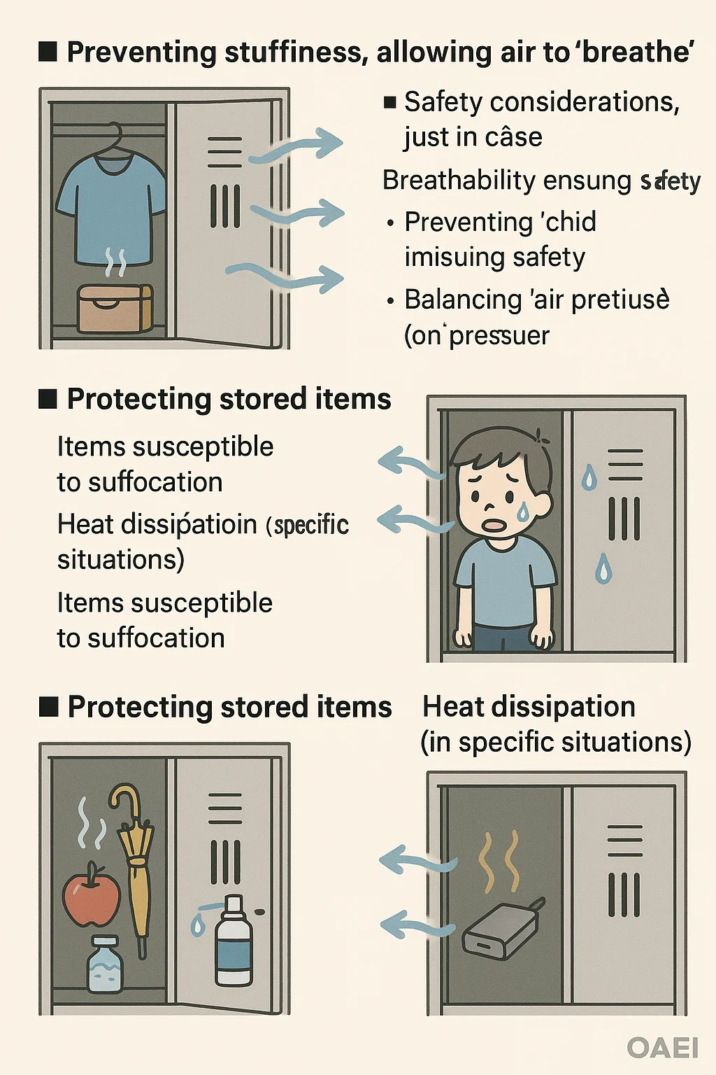 Cosc ar "sweating": I aimsir fuar, tá an teocht taobh istigh den taisceadán ard (m.sh., ó earraí te a stóráil), cé go bhfuil an teocht lasmuigh íseal, rud a fhágann go gcruthóidh comhdhlúthú ar na ballaí istigh (cosúil le "sweating" ar an taobh amuigh de chupán). Cuidíonn poill aerála an teocht agus an taise a chothromú, ag laghdú an "sweating" seo agus ag cosaint leabhair, doiciméid, nó míreanna taise-íogair a stóráiltear taobh istigh.